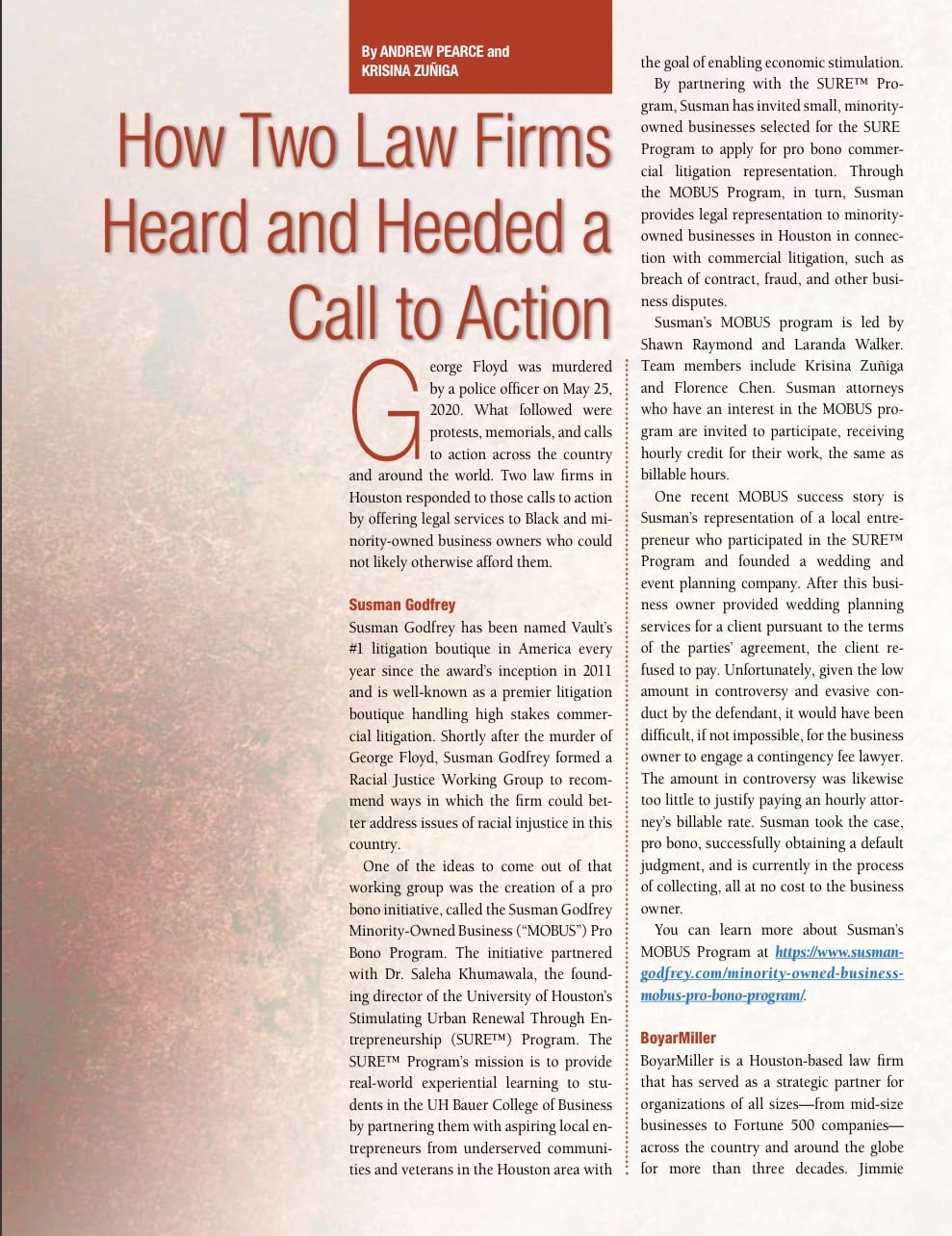 Associate Krisina Zuñiga has co-written an article for The Houston Lawyer about Susman Godfrey’s response to a national call to action in the wake of the killing of George Floyd.