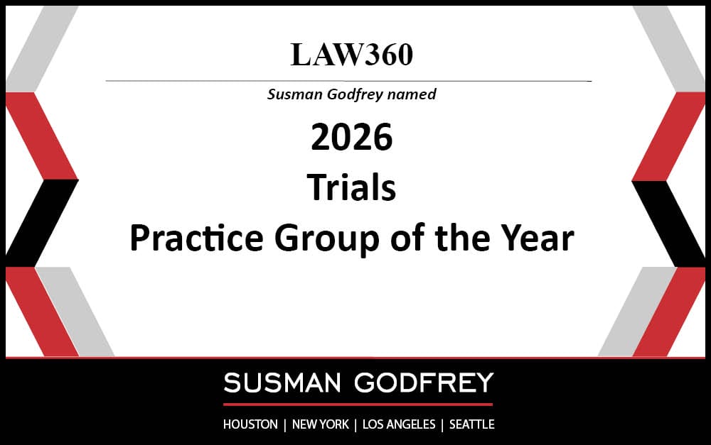 Susman Godfrey has been named one of Law360’s Trials Practice Groups of the Year, recognizing the firm’s exceptional record of success in high-stakes litigation nationwide. The honor follows a year of headline victories, including a more than $970 million arbitration award for Everly Health in a contract dispute involving at-home COVID-19 test kits and a $1.6 billion judgment against China Construction America Inc. arising from the failed Baha Mar megaresort project in the Bahamas.